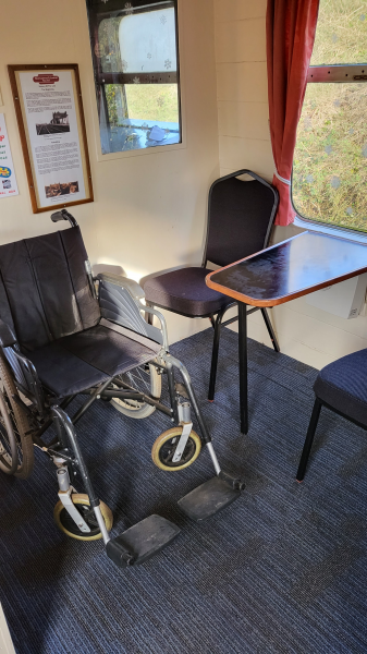 The Accessibility Compartment can accommodate 1 wheelchair and 2 Companions/Carers or 4 persons seated with no wheelchair. Please contact enquiries@nlr.org.uk if you require any help.